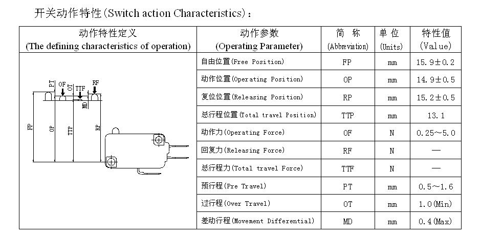 | Mikrospínač | Technický parameter | Hodnota | |
