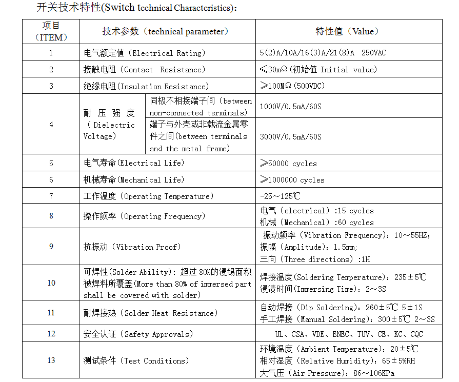| 1 | Elektrické hodnotenie | 5(2)A/10A/16(3)A/21(8)A 250VAC | |